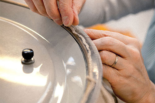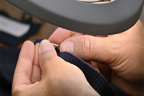 You will then discover one of SAINT JAMES’ most emblematic crafts: raccoutrage, or hand finishing. With their skilful, delicate fingers, our menders are the guardians of the impeccable quality of our jumpers. They correct stitches missed by the machine, remove any foreign fibres, and perfect details such as the elbow patches.